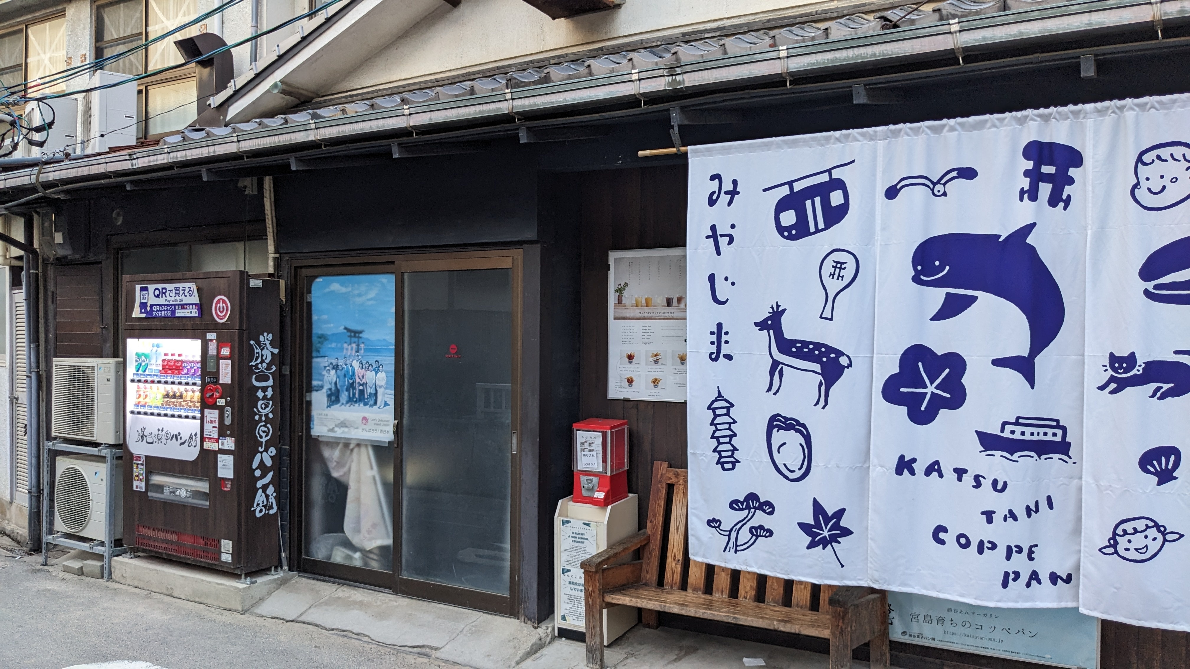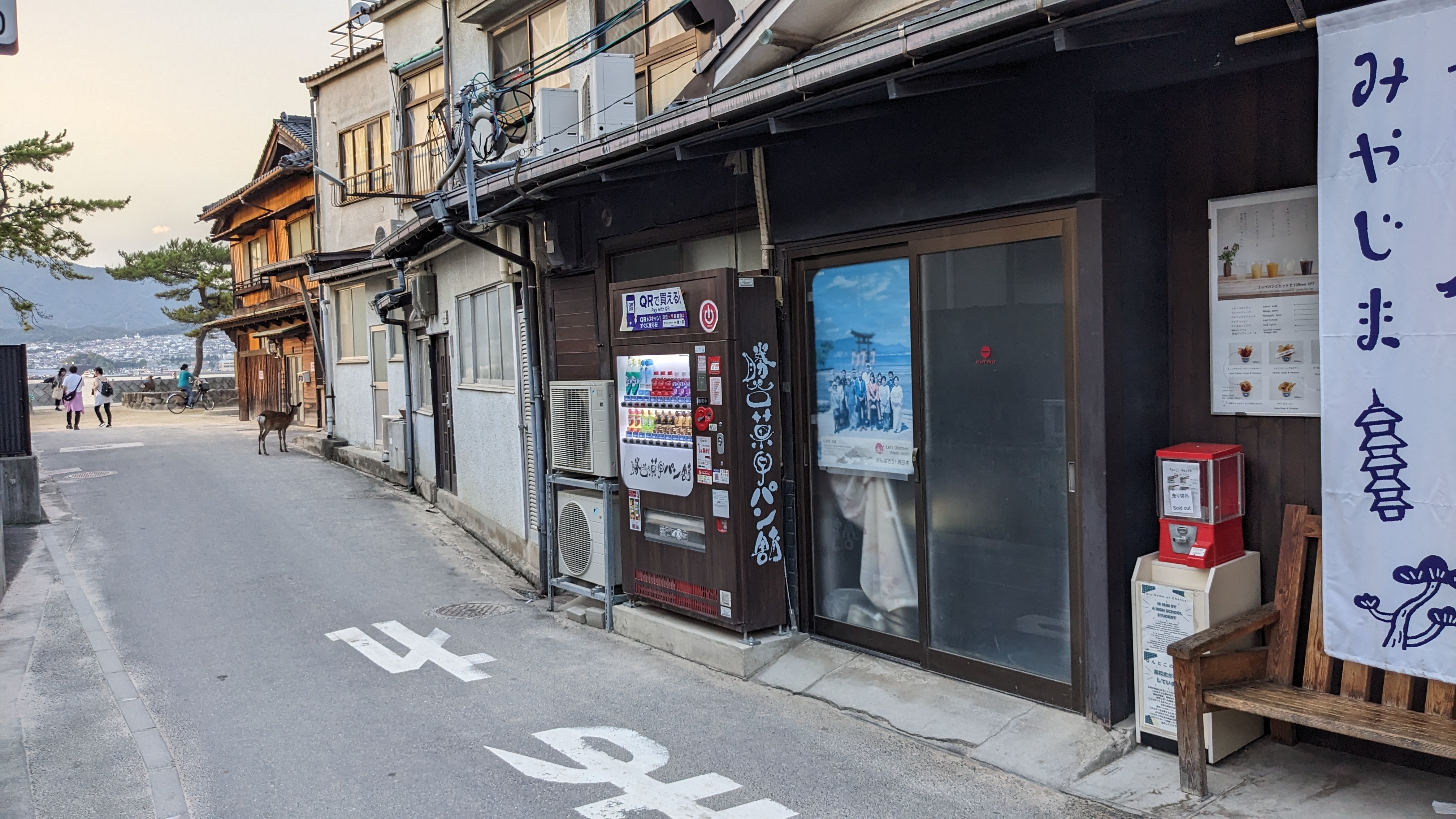 宮島では奈良で撮ろうと思った写真が撮れた。奈良ほどじゃないけど、宮島にも多くの鹿がいた。残念ながら鹿は自販機からちょっと遠いけど、一応厳島神社の大鳥居も写っている。ポスターだけなんだけど。この自販機と多くの宮島の自販機は周りに溶け込んでいるらしくて、この自販機は後ろの建物のような木の模様がある。建物をグーグルマップで調べたら、パン屋で、コッペパンを売っていることが分かった。私はその時コッペパンが何か知らなかったけど、焼きそばパンが大好きだ。またスーパーやコンビニでしか買えないと思っていたから、パン屋に入らなかった。だから、いつか宮島に戻りたくて、このパン屋でコッペパンを試したいと思う。きっと新鮮なコッペパンはなおさら美味いだろう。