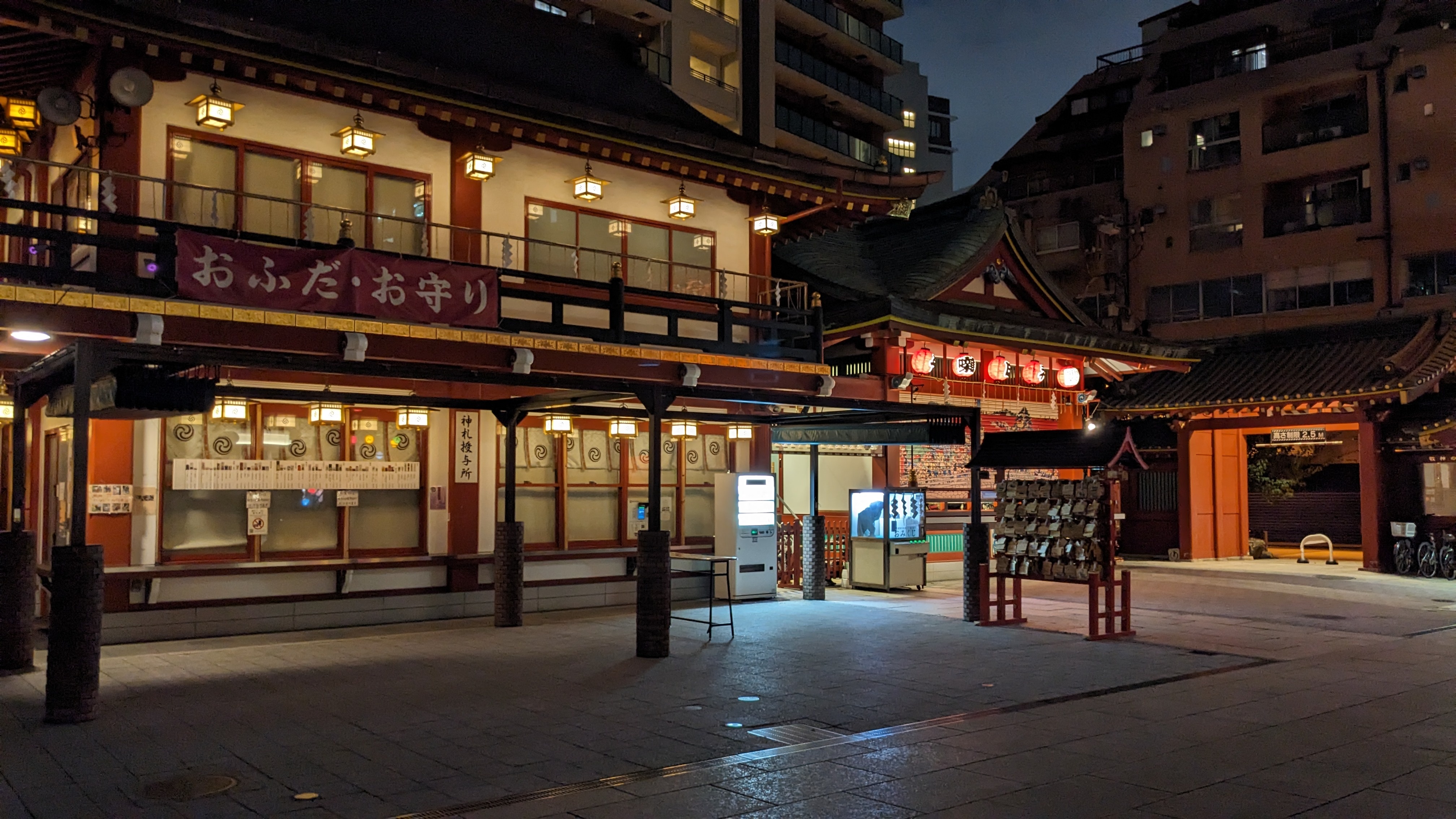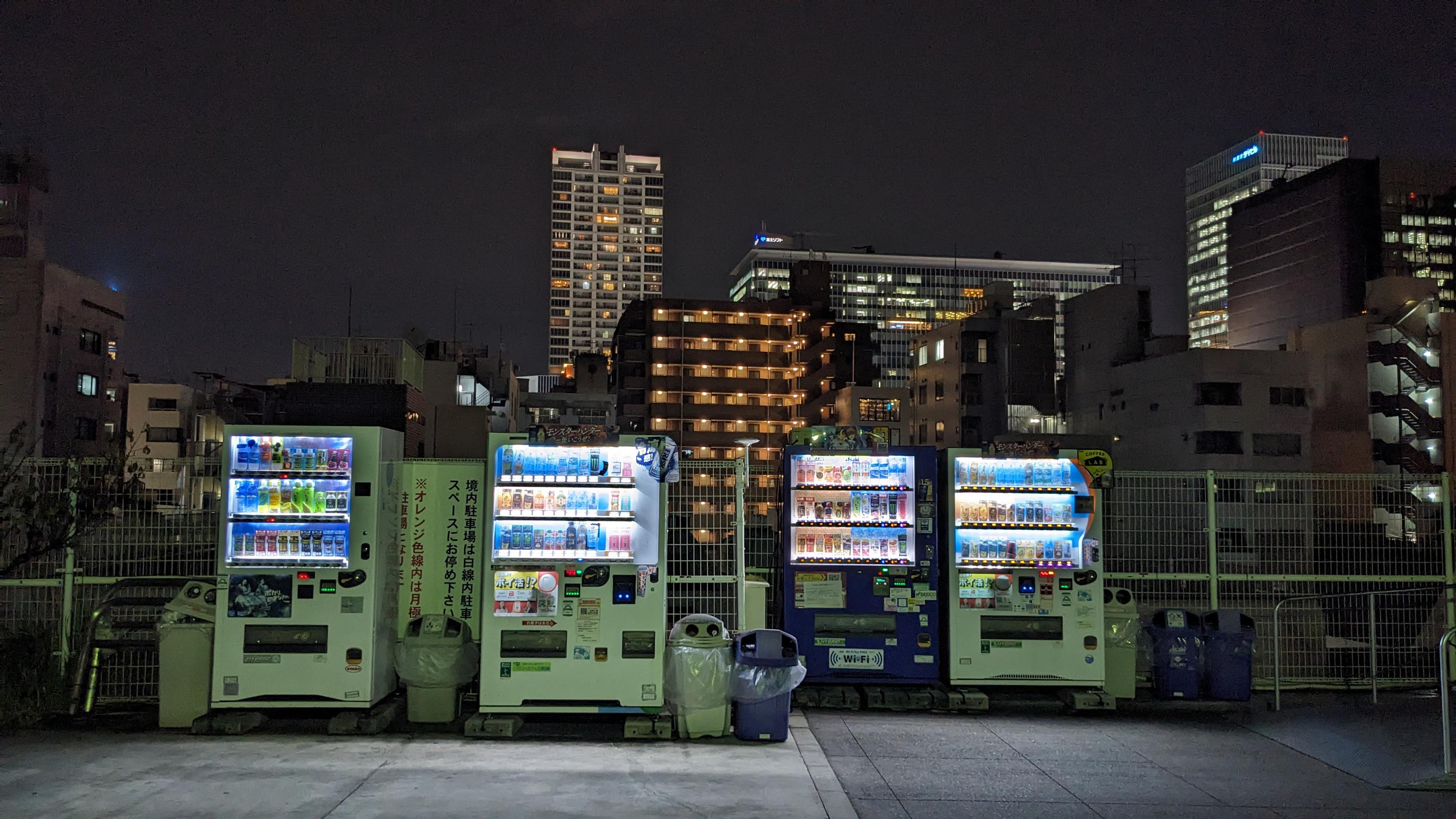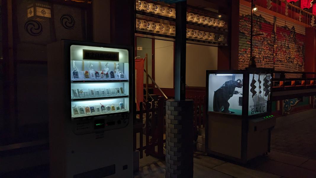 この自販機は摩利支天徳大寺の前にあって、寺そのものはアメ横にある階段の上にあった。夜の美しい光、賑やかな商店街とほとんど人がいなくて静かな寺のコントラスト、上から商店街の景色が好きだった。