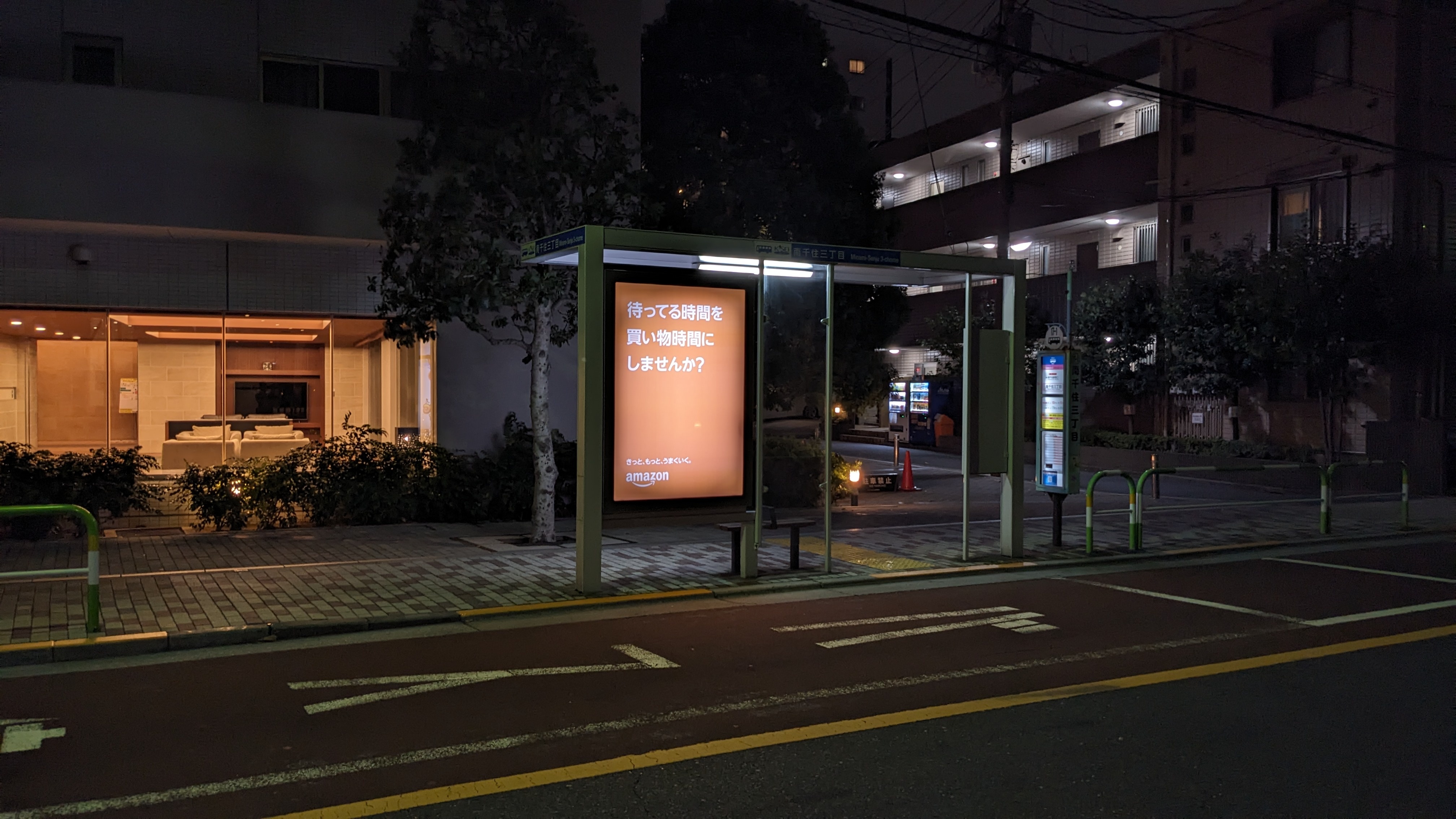 ボーナス自販機はAmazonの広告の背景にある。広告はバスを待っている時間をAmazonの買い物時間にするように勧めるけど、Amazonが気に入らなかったら、背景の自販機でも買うことができる。