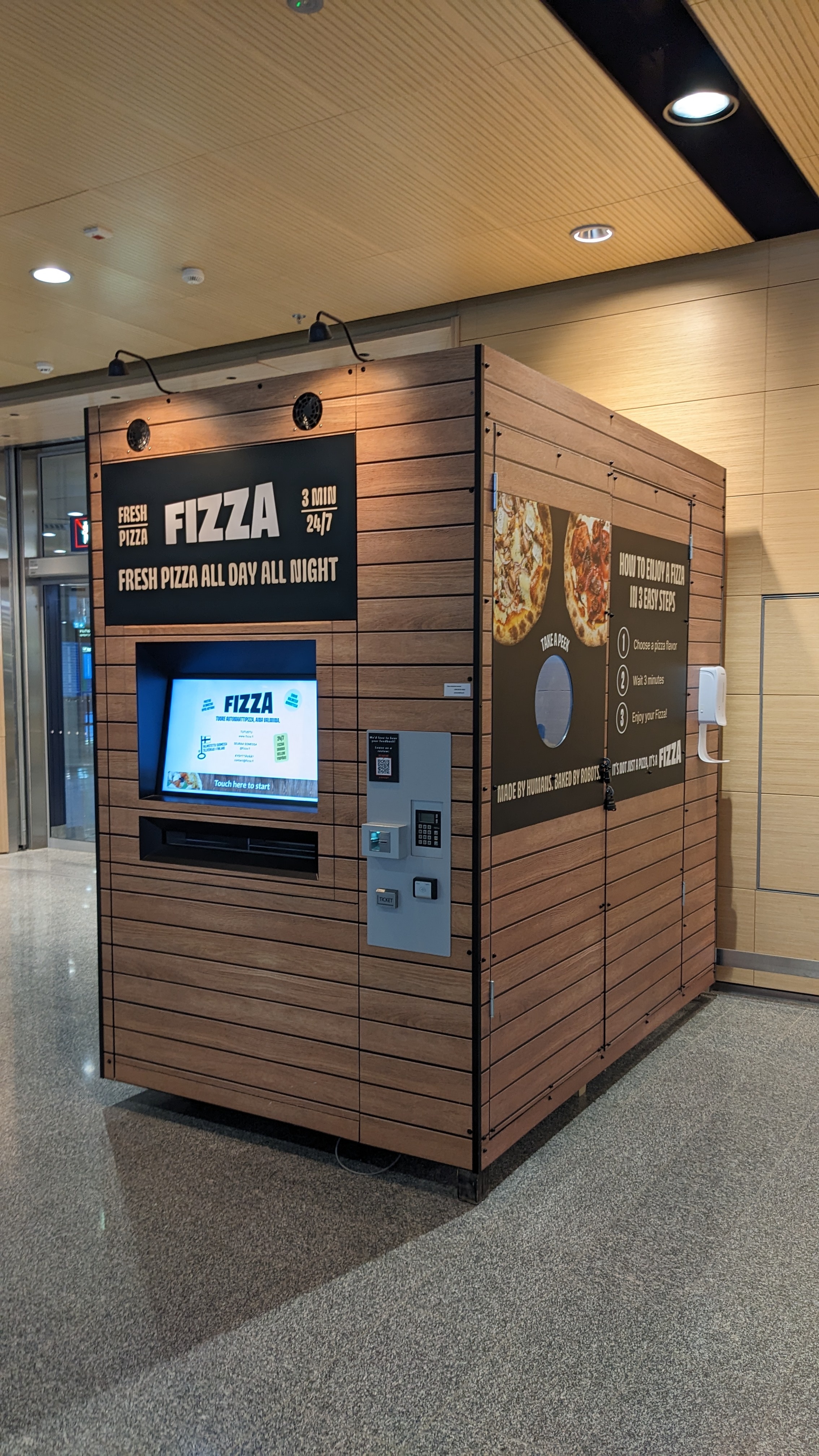 ヨーロッパにヘルシンキ空港で最後の珍しい自販機を見かけた。FIZZAという機械は中にピザを焼かれるから、便が昼間か夜かいつでも新鮮なピザが食べられる。